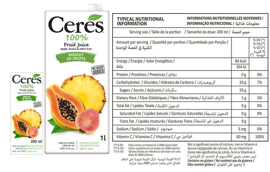 Ingredients: Apple juice, Guava puree, Grape juice, Pineapple juice, Papaya puree, Peach puree, Mango puree, Passion fruit juice, Vitamin C (E300).