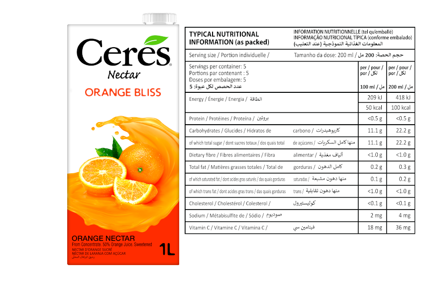 Ingredients: Purified water, reconstituted orange juice concentrate, sugar, orange cells, vitamin C, natural flavouring (orange).